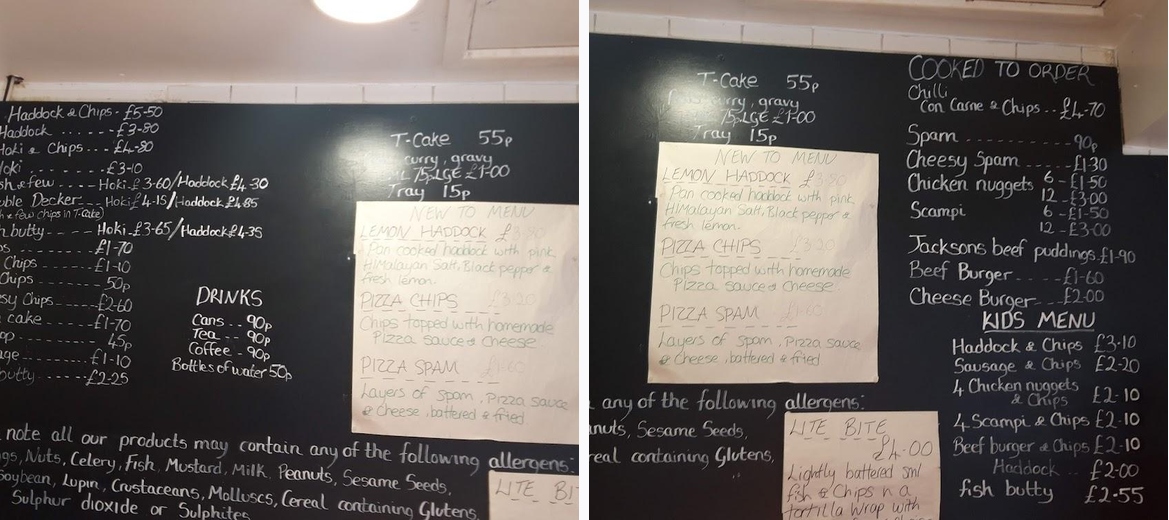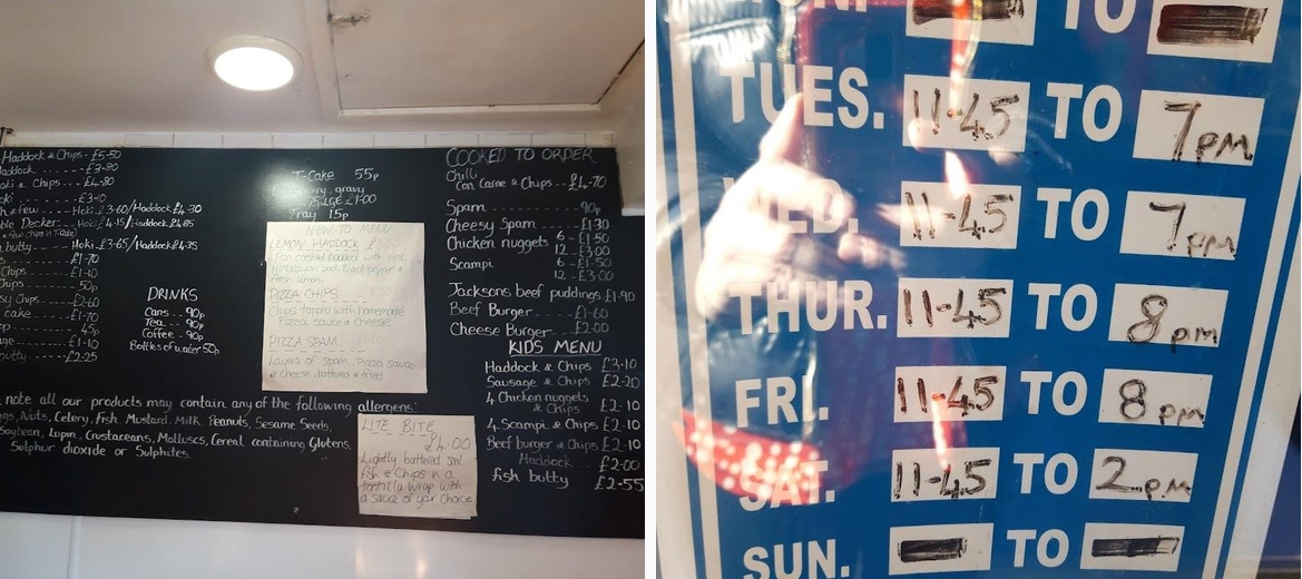 It's a small, traditional, family run,very friendly. great food,amazing prices Haddock and chips £5:50 good portion size..huge menu choice. Cooked fresh while I waited . Definitely recommend.